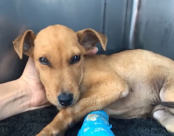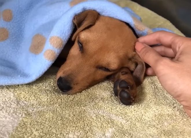 狗狗似乎很累,身体刚沾到毯子便睡着了。女子趁狗狗睡觉,简单的将它体表检查了一遍。除了瘦以外,狗狗非常虚弱,有一条腿还受了伤,看来它在前主人那里的日子过得很艰难。